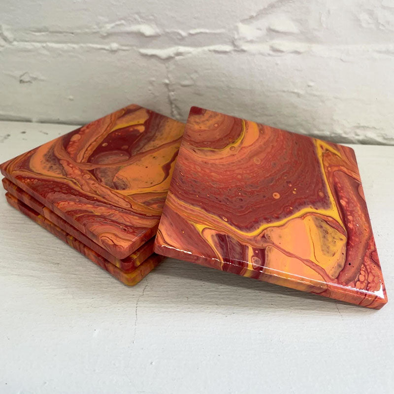 Please note: Once the coasters are fully dry, a protective resin layer will be added to the top, and cork will be attached to the bottom to prevent scratching and ensure durability. Projects will be available for pickup. roughly 7-9 days after class.